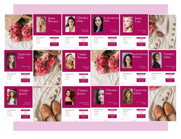 Wybierz dowolny z 12 typów kolorystycznych, a otrzymasz kompletny przewodnik, który krok po kroku pokaże Ci, jak wykorzystać ten typ w praktyce.